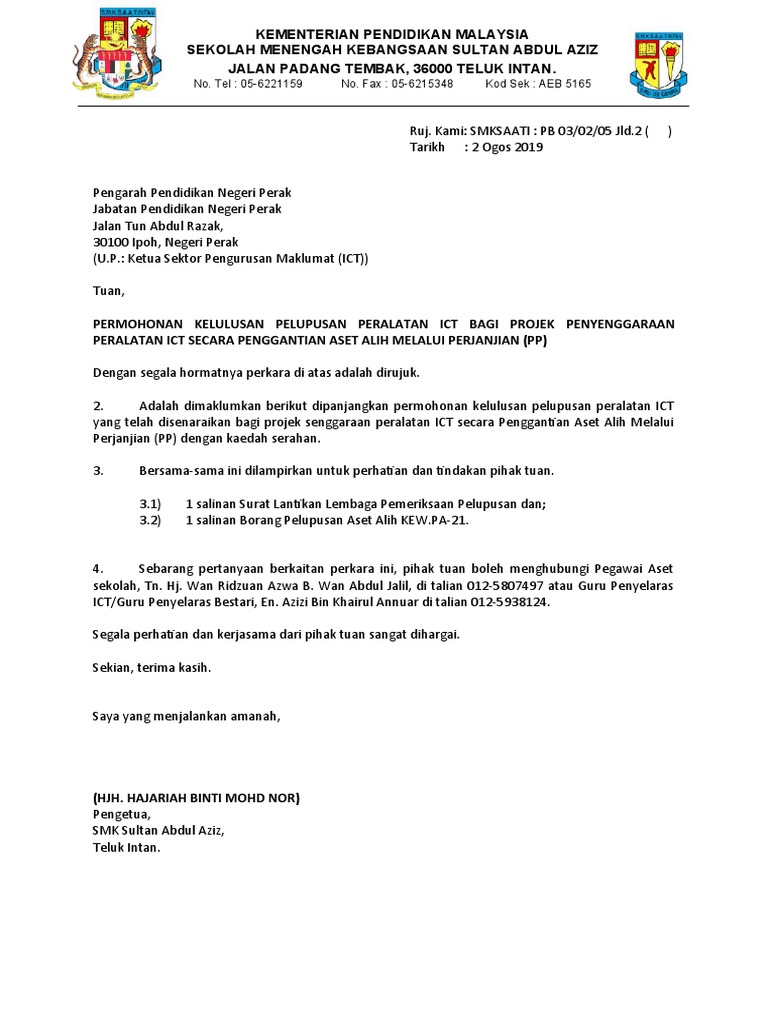 Contoh Surat Permohonan Pelupusan Aset - Contoh surat permohonan pindah tugas.. Surat permohonan yaitu surat permintaan terkait suatu hal kepada pihak lain yang dibutuhkan. | surat permohonan izin untuk meminta izin kepada atasan kita bahwa kita tidak dapat menghadiri suatu kegiatan oleh karena sesuatu hal yang sangat penting. Setiap jenis surat pelepasan memainkan peranan bagi sesuatu perkara contohnya pelepasan jawatan dari majikan. Contoh cara membuat surat resmi | contohsuratpediacontoh surat perjanjian kontrak rumah sederhana terbaru 2020yang baik dan tepat hallo sahabat. Penjelasan lengkap seputar contoh surat permohonan.